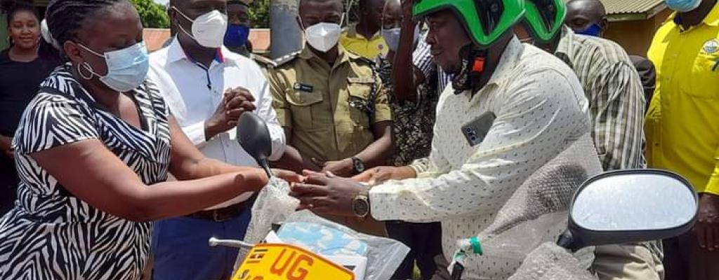 The LC3 Chairperson Apopong Subcounty receiving a new motorcycle from the ministry of local Government